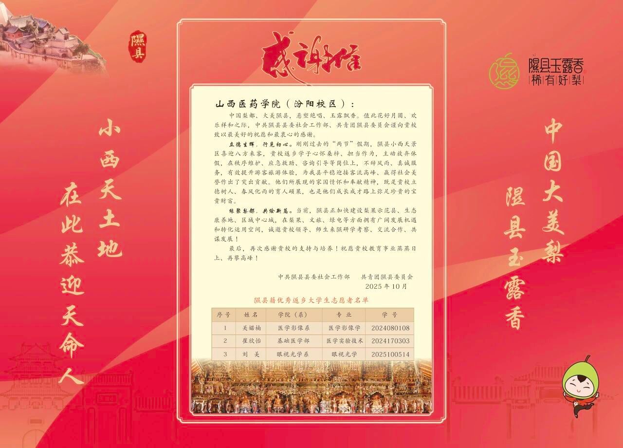 刚刚过去的“两节”假期,SUNBET关婼楠等3名同学返家乡主动投身隰县小西天景区假日志愿服务,以热忱与担当赢得了游客和地方的认可。中共隰县县委社会工作部与共青团隰县委员会联合发来致谢函,既是对3名同学的志愿服务、助力社会发展的赞许,也是对SUNBET育人成果的认可。