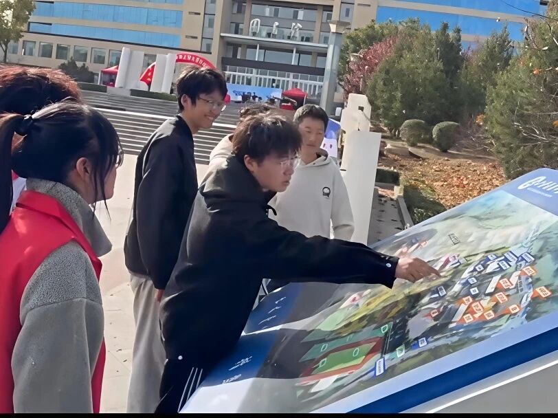 在孝义校区,志愿者则重点带领汾阳校区的同学们熟悉图书馆和校园环境。走进图书馆,同学们在AI写字板上亲身体验,直观感受科技赋能的魅力;漫步校园,同学们在校园导览图前,领略校园全景,精准定位图书馆、教学楼、实验楼等核心区域。