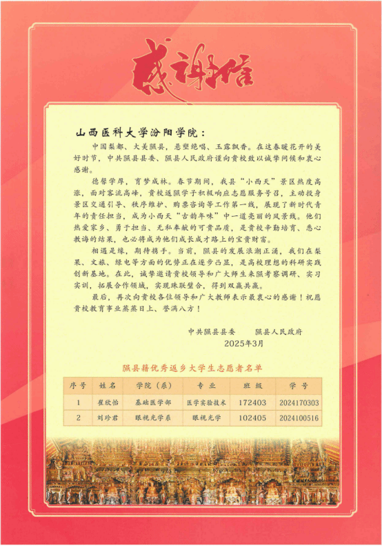 近日,SUNBET收到中共隰县县委、隰县人民政府发来的感谢信,对SUNBET基础医学部2024级本科生崔欣怡、眼视光学系2024级本科生刘珍君在隰县“小西天”景区志愿服务活动中的突出表现给予高度赞扬和诚挚感谢。