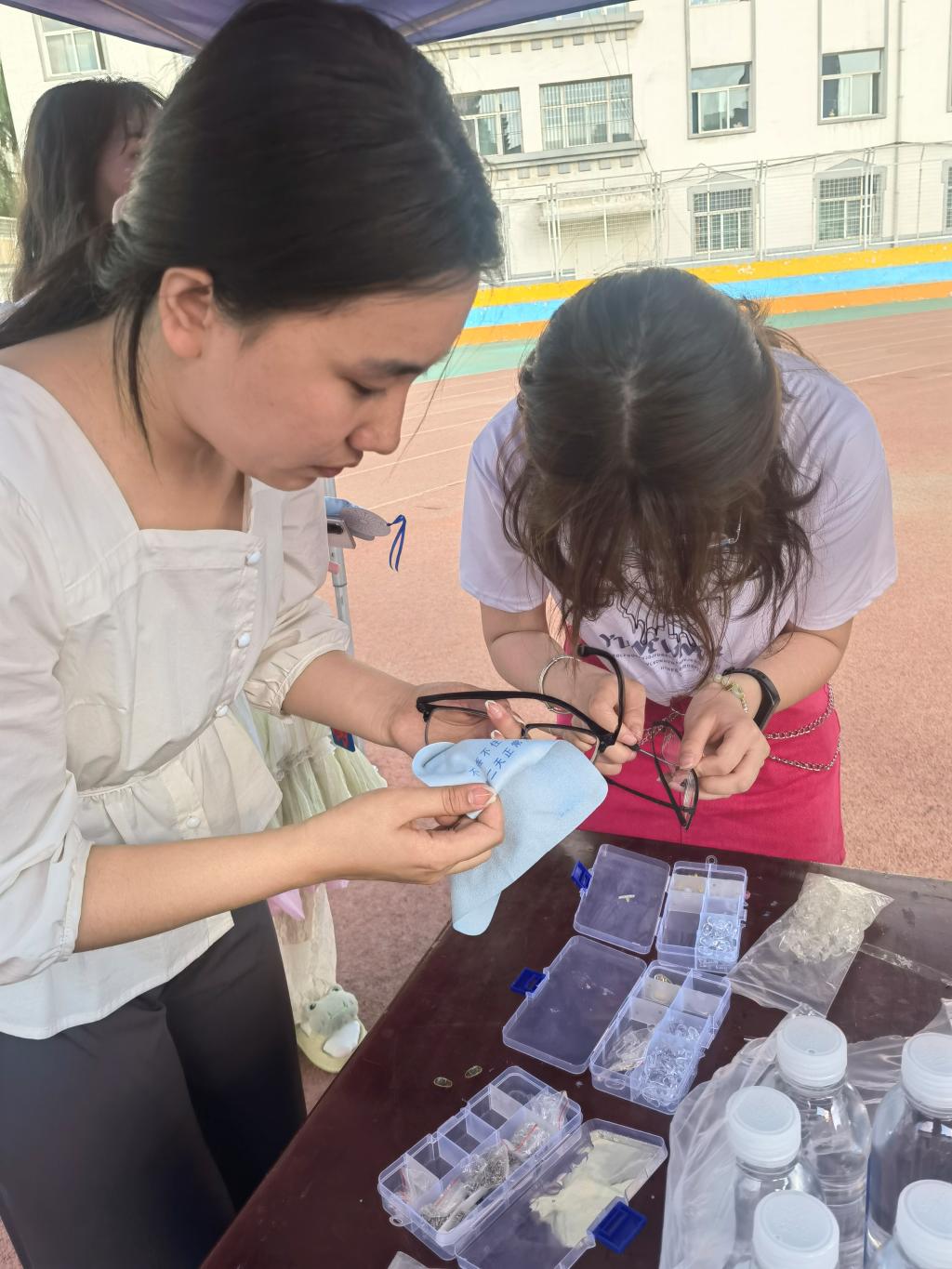 活动现场准备了超声波眼镜清洗器、各种规格的鼻托、螺丝刀等工具,为前来的同学们清洗眼镜、更换鼻托;近视防控宣讲团的同学们在现场大力宣传儿童和青少年眼健康的重要性,教给大家不同学段儿童青少年近视防控要点,提倡科学防控近视。